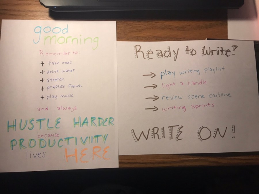 To help with my problem of being too intimidated to write, I decided at my Turning Point to try to write every day. Even if it’s only a little bit, I’ll at least be getting something done a little bit every day. I’m not perfect and I miss days, but the idea behind it is really important. I especially find it helpful to do writing sprints. I’ll do about 20 minutes at a time, where I sit down, put on my music, and write without taking any breaks to check my phone or anything. It really gets me in the zone of the story, and a lot of the time, inspires me to keep going even past the sprint. Which I think is kind of the point.