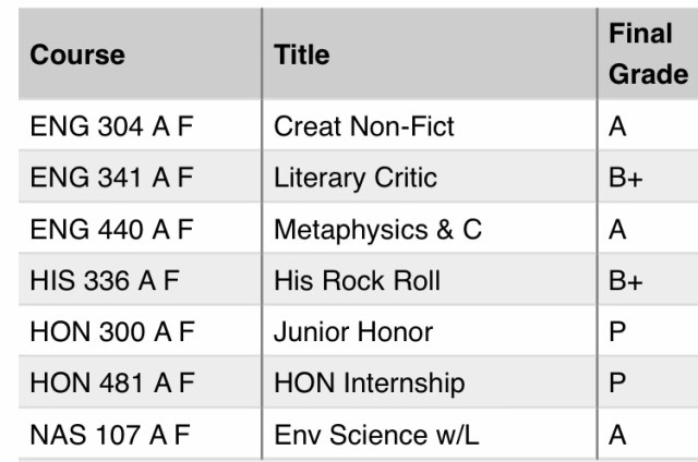 Creative Non-fiction – Not my favorite class. I enjoyed having a creative outlet to force me to write, but I didn’t enjoy the way the class was taught and didn’t feel like I learned too much. Still, I had plenty of opportunities to talk about myself, which is my favorite thing to do. Final Grade: A