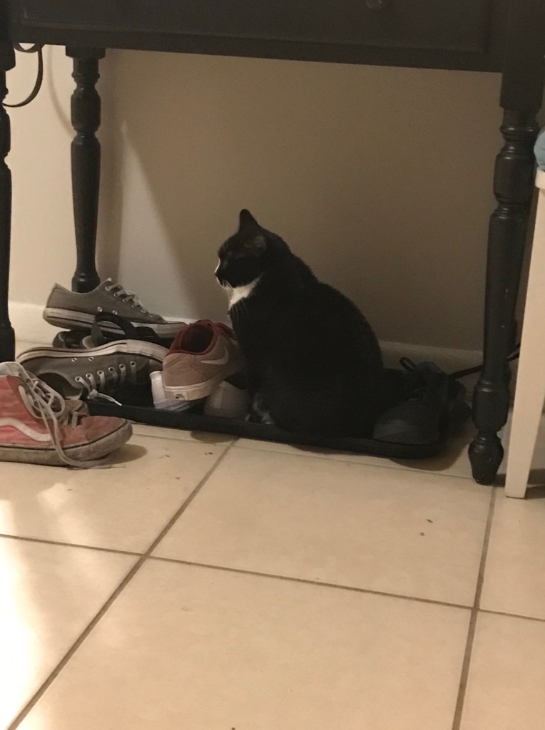 Over winter break, my roommate’s girlfriend’s cat moved in. Her name is Hillary Kitten (named in 2016, don’t judge), and she is the best cat I have ever lived with. She’s visited before, so she and Pi are already familiar. She is constantly vibing with us and never causing any trouble, unlike many cats we have lived with (we all remember Charlie, and she wasn’t even the worst). Kitten is a blessing to our household.